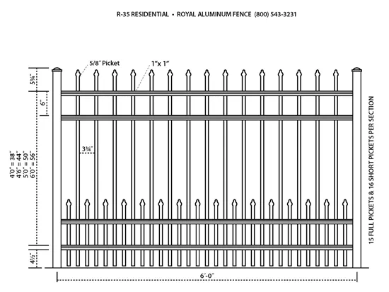 Horizontal Rail: 1 Side Wall: 0.090 Top Wall: .100 Picket: 5/8 Picket Spacing: 3-3/4 Section Length: 72 Heights Available: 3′, 3’6 Posts Available: 2